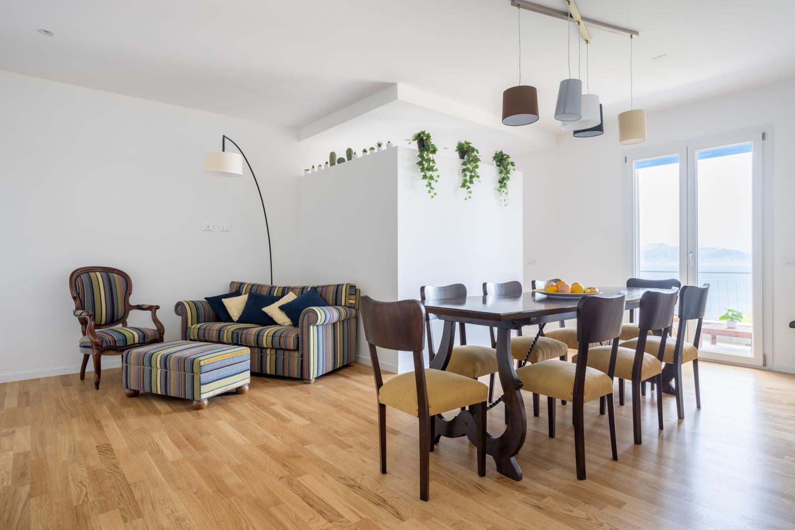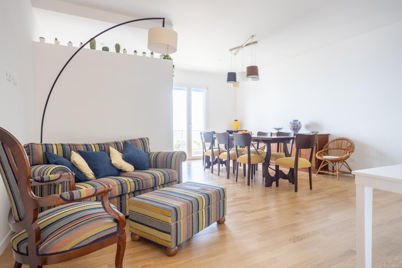 Lasciatevi sedurre dal fascino di Casa Maiolica, un rifugio di design situato al primo piano di Villa delle Rocce. Perfetto per chi cerca spazio e privacy, l'appartamento vanta due raffinate camere matrimoniali e due bagni moderni con doccia, eliminando ogni attesa al mattino. Il cuore della casa è il soggiorno panoramico con cucina a vista, che si apre su una terrazza arredata: il luogo ideale per contemplare l'infinito sorseggiando un calice di vino locale.